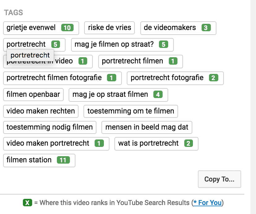 Hiermee kan je bijvoorbeeld gericht tags zoeken, maar ook zien hoe goed een tag het doet. Staat er een kleine groene 1 bij een tag? Dan komt jouw video als eerste omhoog wanneer iemand die zoekwoorden gebruikt.