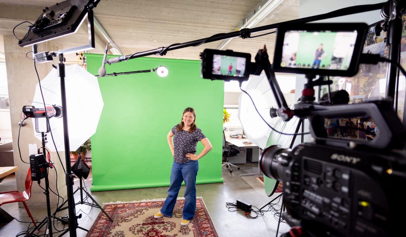 De persoon staat daar dan in het midden voor. Let bij de positie van de spreker op dat ze niet in het licht van de achtergrond lampen staat, en niet te dicht bij de groene achtergrond. Daardoor voorkom je schaduwen op de groene achtergrond, waardoor het keyen uiteindelijk makkelijker wordt.